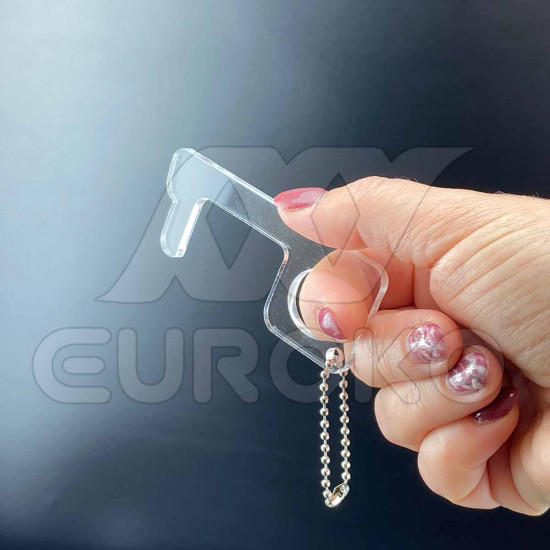 Der kontaktloser Türöffner wird aus durchsichtigem Acryl mit kleiner Kette produziert. Dank der kurzen Kette können Sie das auf Ihrem Schlüsselbund oder einfach in Ihrer Hosentasche mitnehmen. Ausgezeichnete Möglichkeit für Firmen als eine Werbefläche. Die kurze Produktionszeit und die hochwertige Qualität sind garantiert!